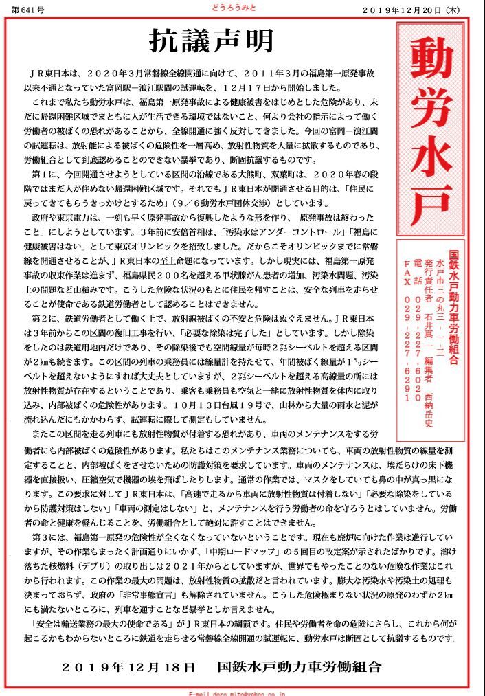 「安全は輸送業務の最大の使命である」がJR東日本の綱領です。住民や労働者を命の危険にさらし、これから何が起こるかもわからないところに鉄道を走らせる常磐線全線開通の試運転に、動労水戸は断固として抗議するものです。