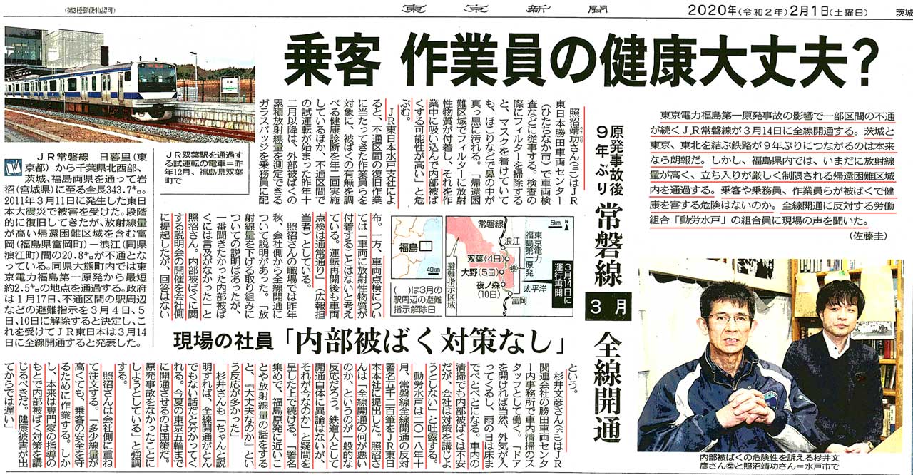 福島第一原発に一番近い駅である大野駅をはじめ特急列車が停車します。東京・品川から、宮城・仙台まで、毎日3往復します。双葉駅、大野駅、浪江駅とドアを開け、誰も住んでいない町に電車を走らせます。2月1日付の東京新聞茨城県版に、表題の記事で、動労水戸の組合員の不安の声が紹介されました。